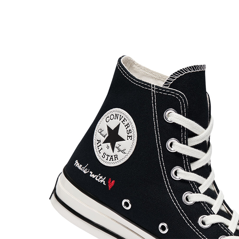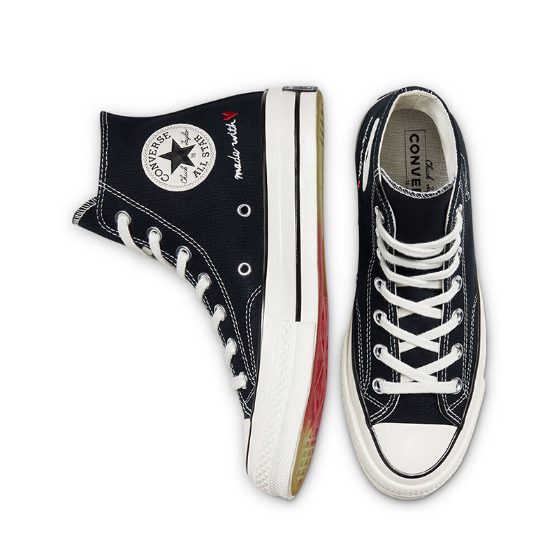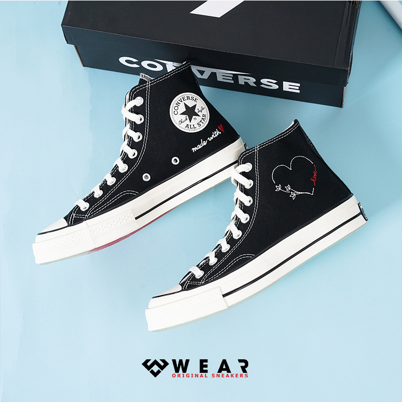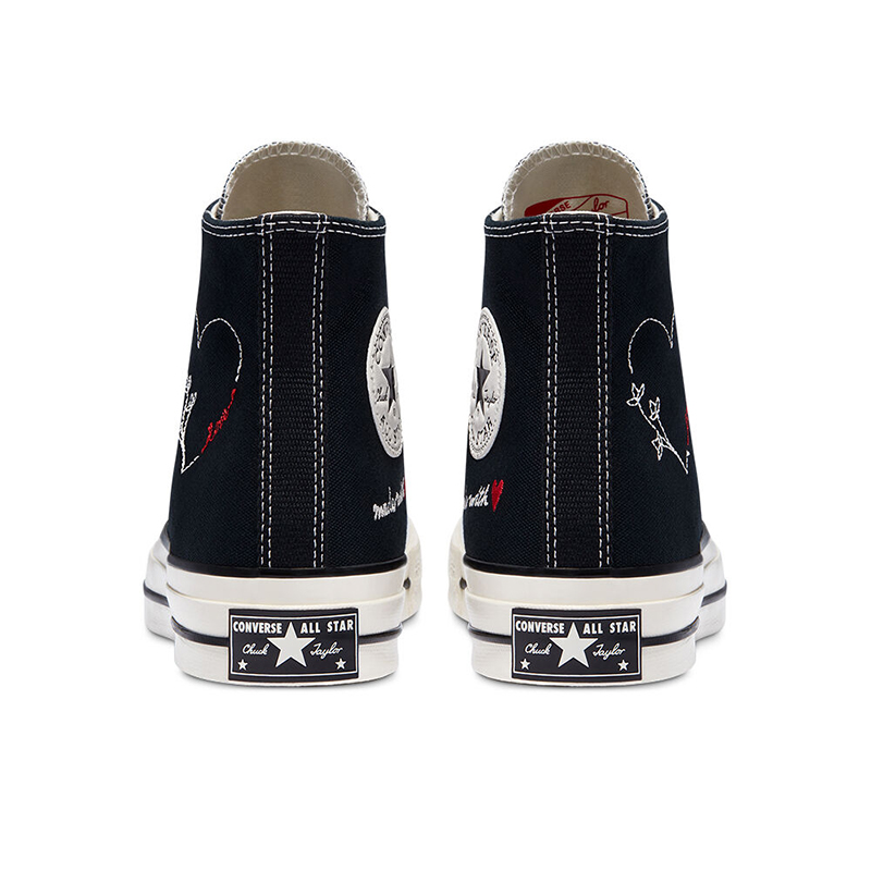 Bên cạnh đó, hai tông màu được Converse lựa chọn đó chính là màu đỏ và đen – hai phiên bản tạo được sự nổi bật cho sản phẩm. Trên thân giày, thêu nổi hình trái tim được nối liền với nhau, dòng chữ “made with love” tinh tế nhỏ nhắn đặt song song với đế giày – không quá lố nhưng vẫn cực kỳ tình và gây được thiện cảm của người dùng.
